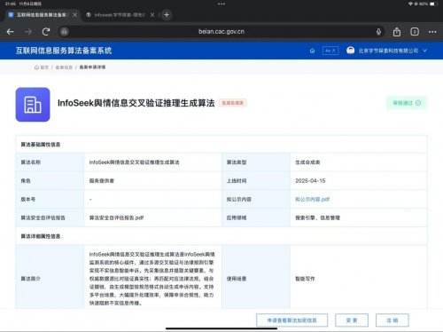 从行业背景看,深度合成算法备案自 2023 年启动以来,已成为衡量科技企业技术合规性的核心指标。截至 2025 年 9月,我国算法备案已进入常态化阶段,北京、广东等数字产业高地贡献了 80% 以上的备案主体,Infoseek 此次备案进一的技术领先地位。